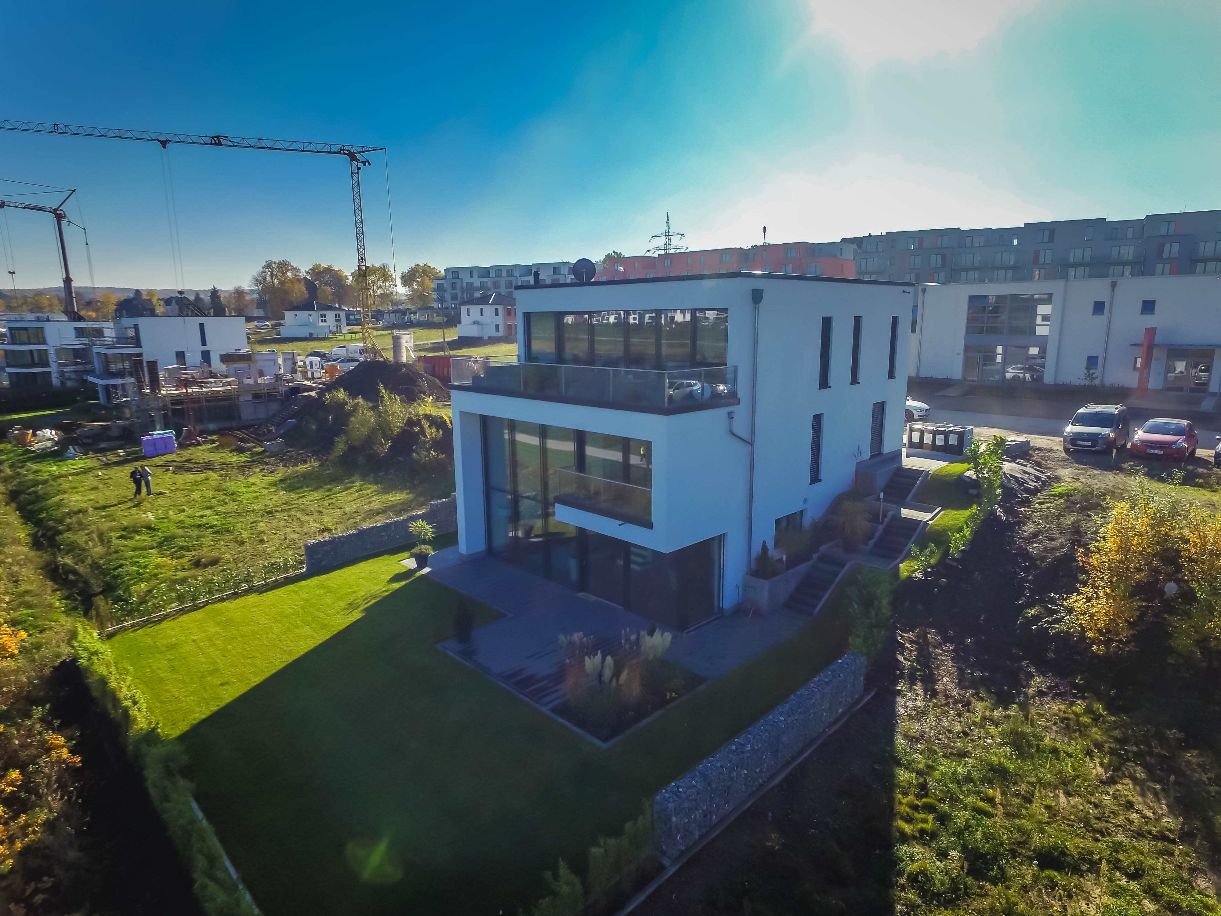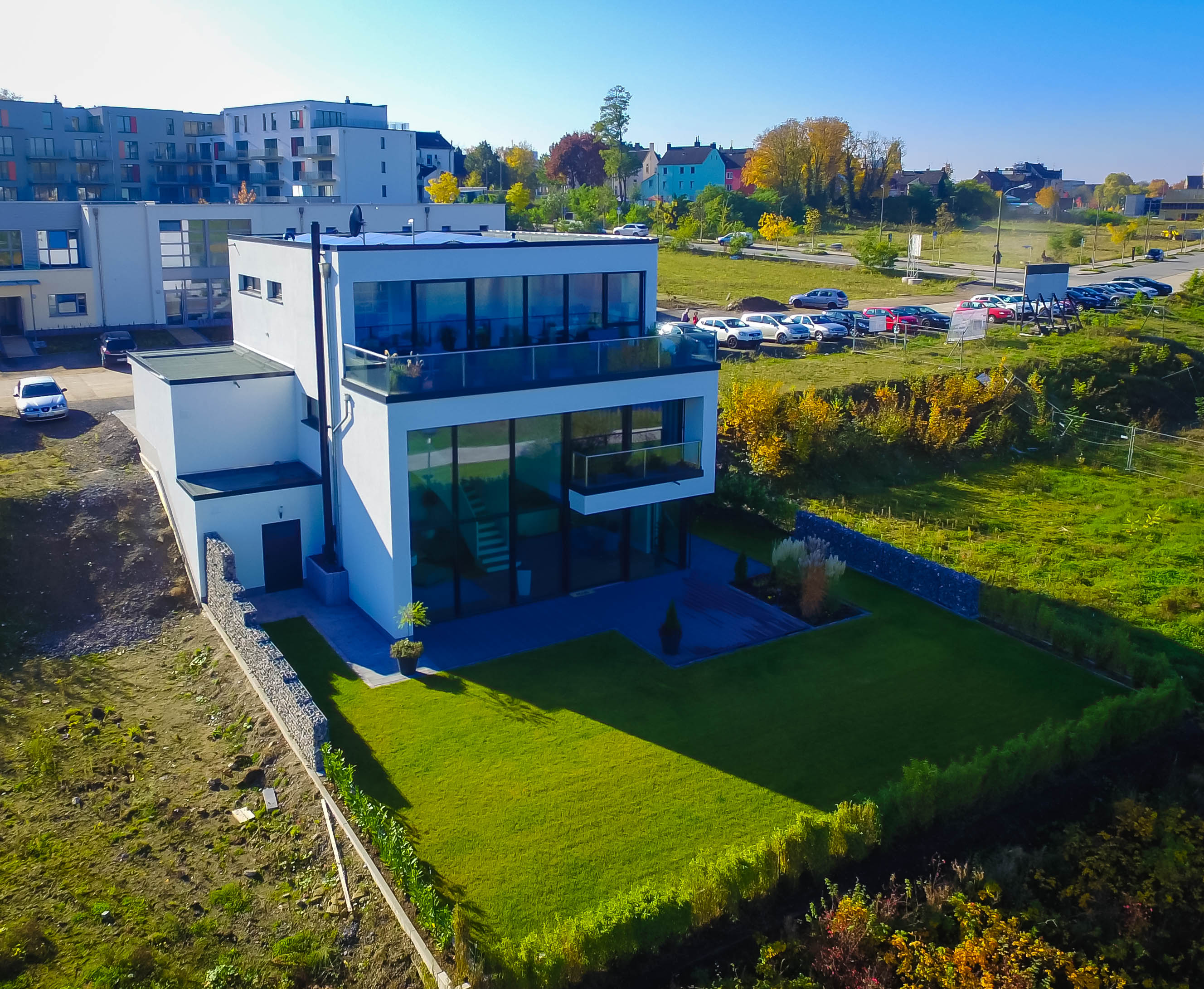 die heizungsanlage besteht aus einer erdwärmepumpe, zusätzlich ergänzen photovoltaik-elemente auf dem flachdach das energetische konzept.