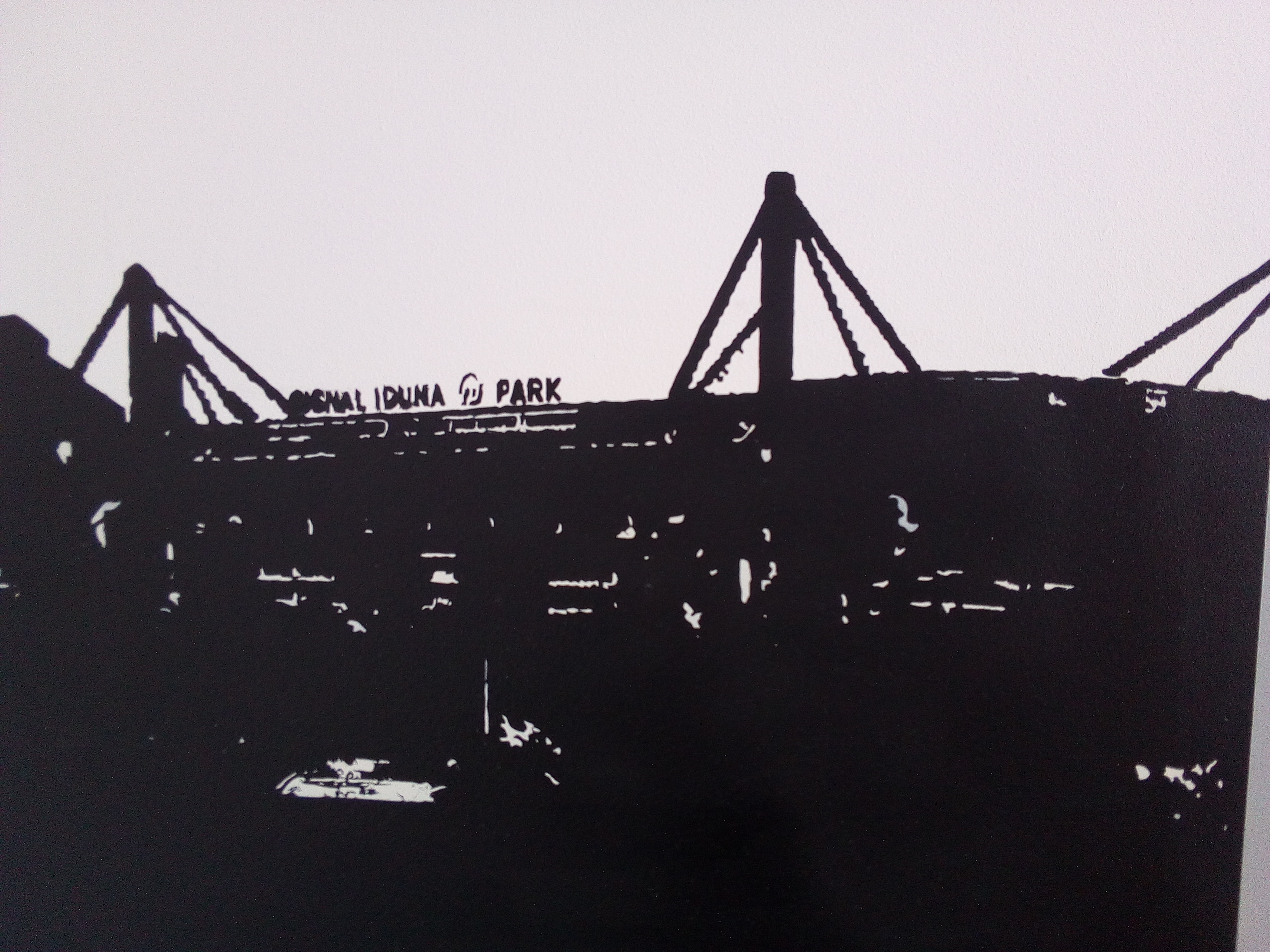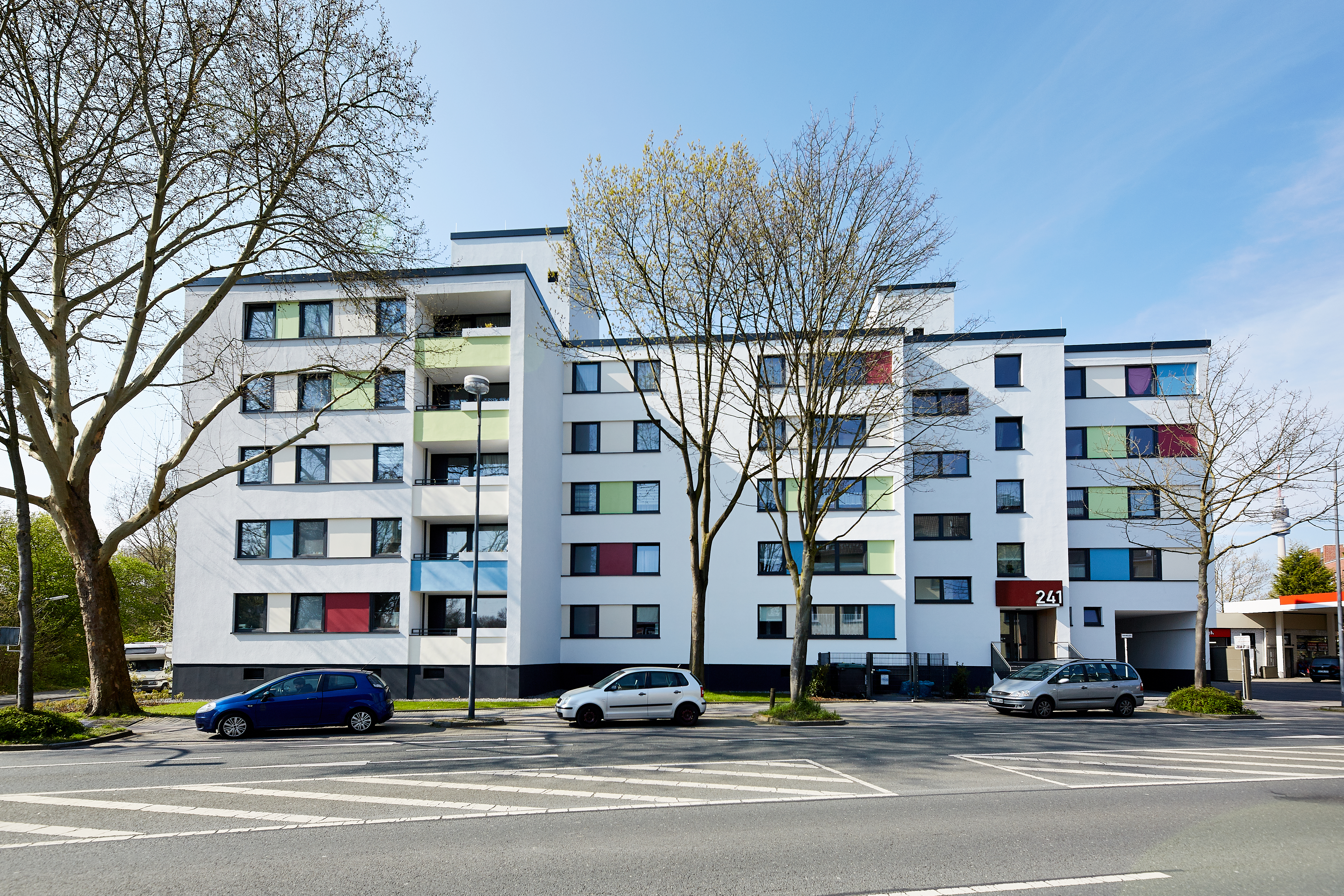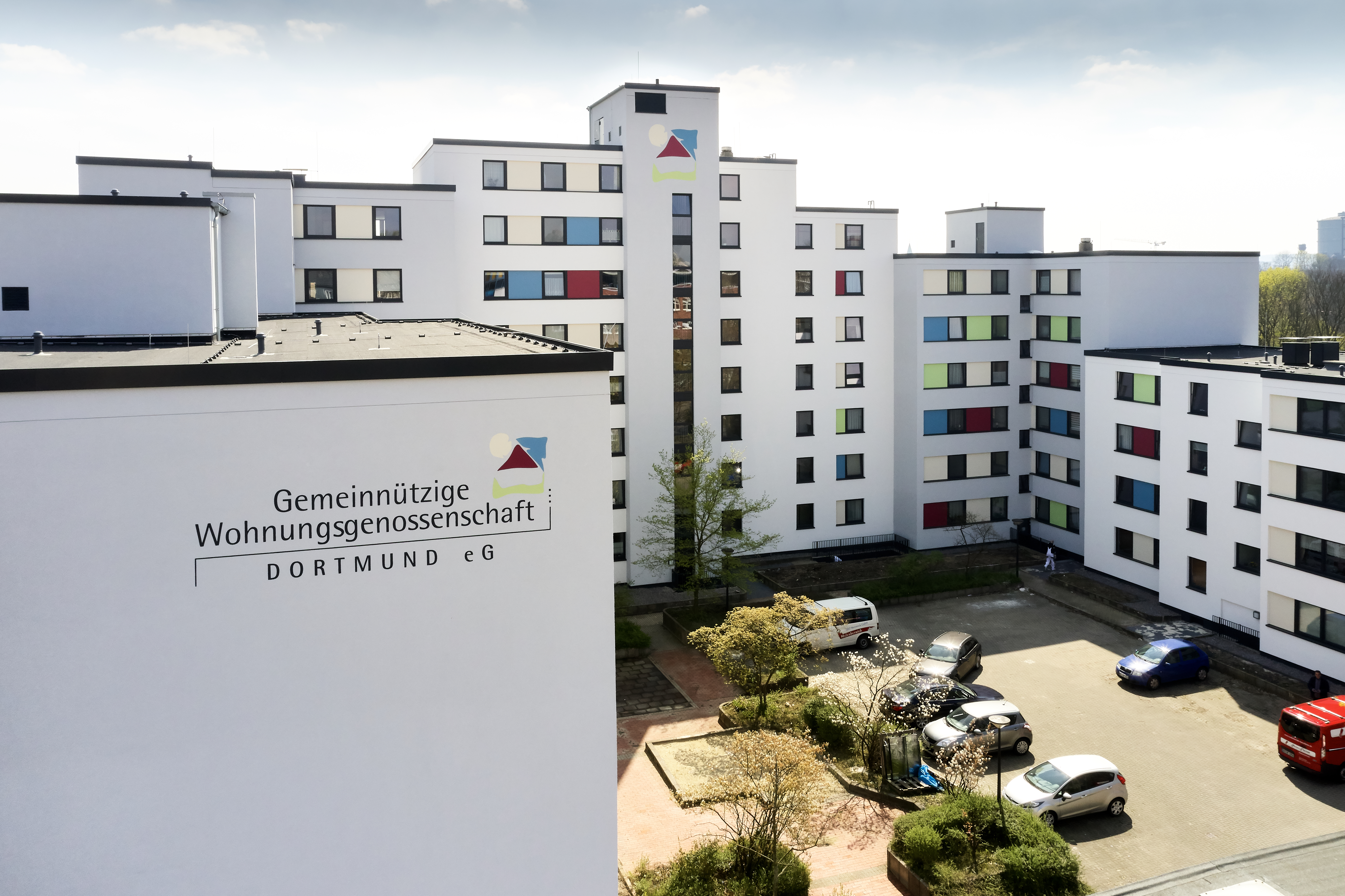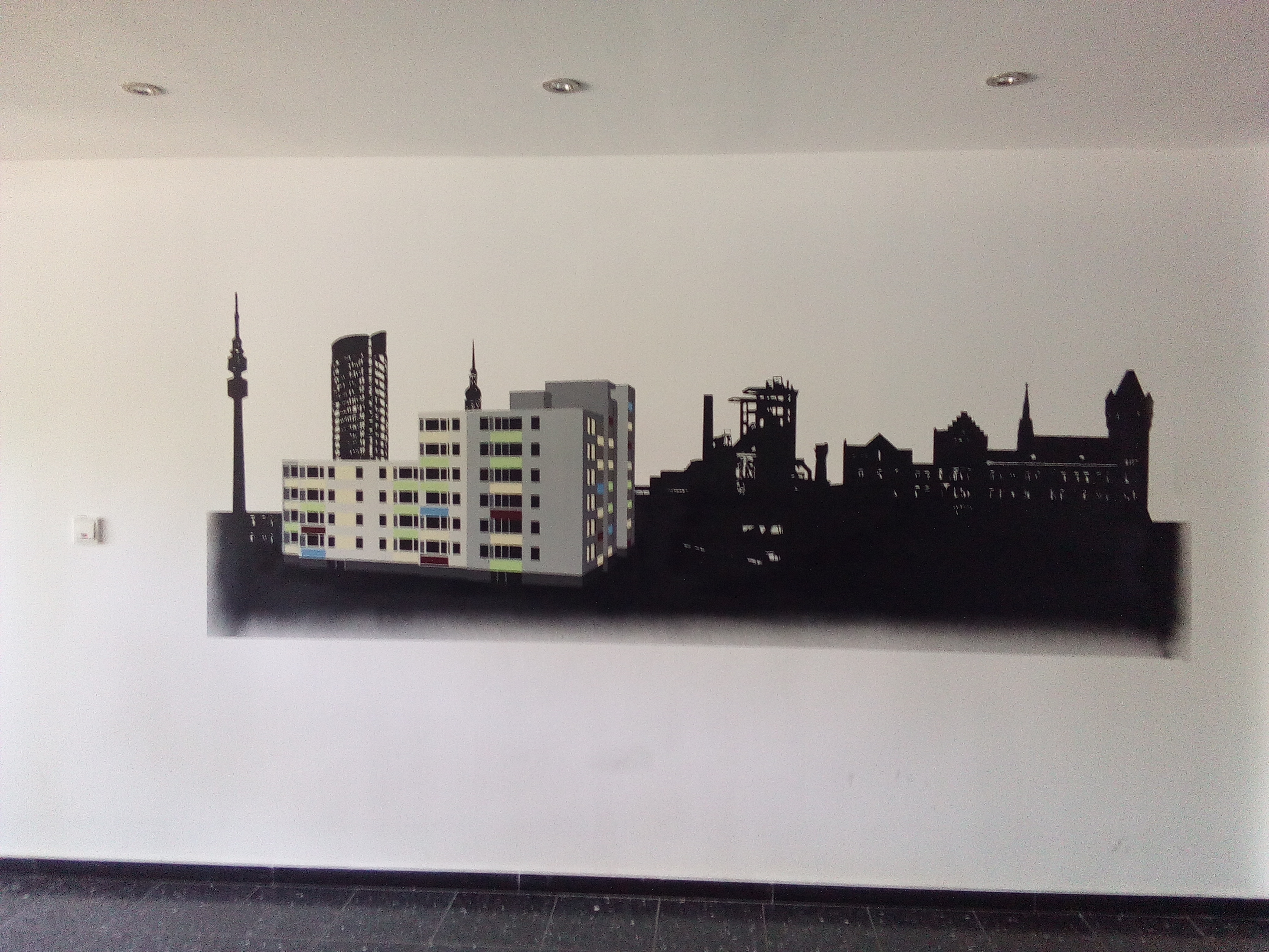 die vier haupteingänge erhielten zudem ihre eigene adresse durch die wandgestaltung. gegenüber der neuen briefkastenanlagen wurde die skyline dortmunds aus dem jeweiligen blickwinkel auf den hauseingang nachempfunden.