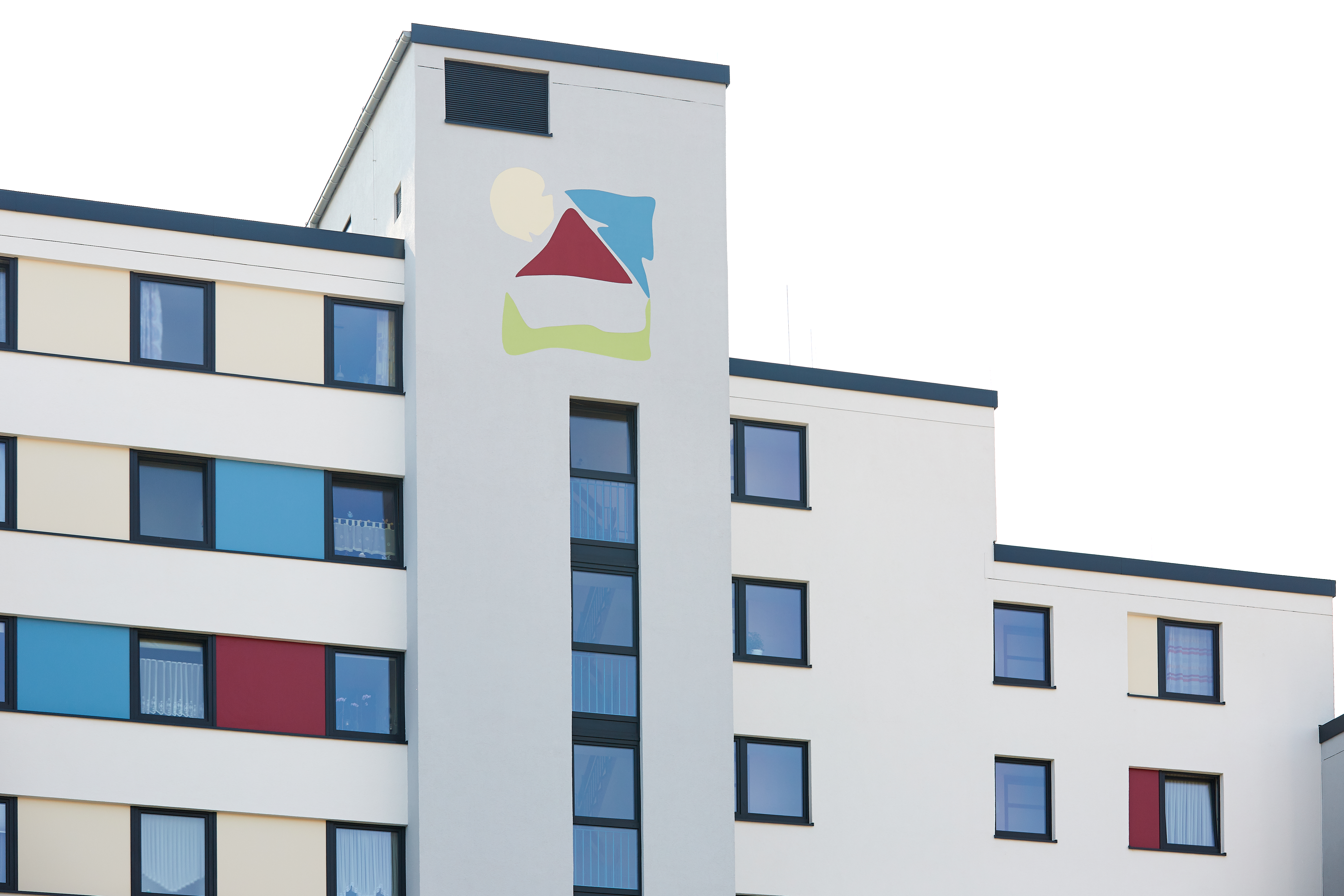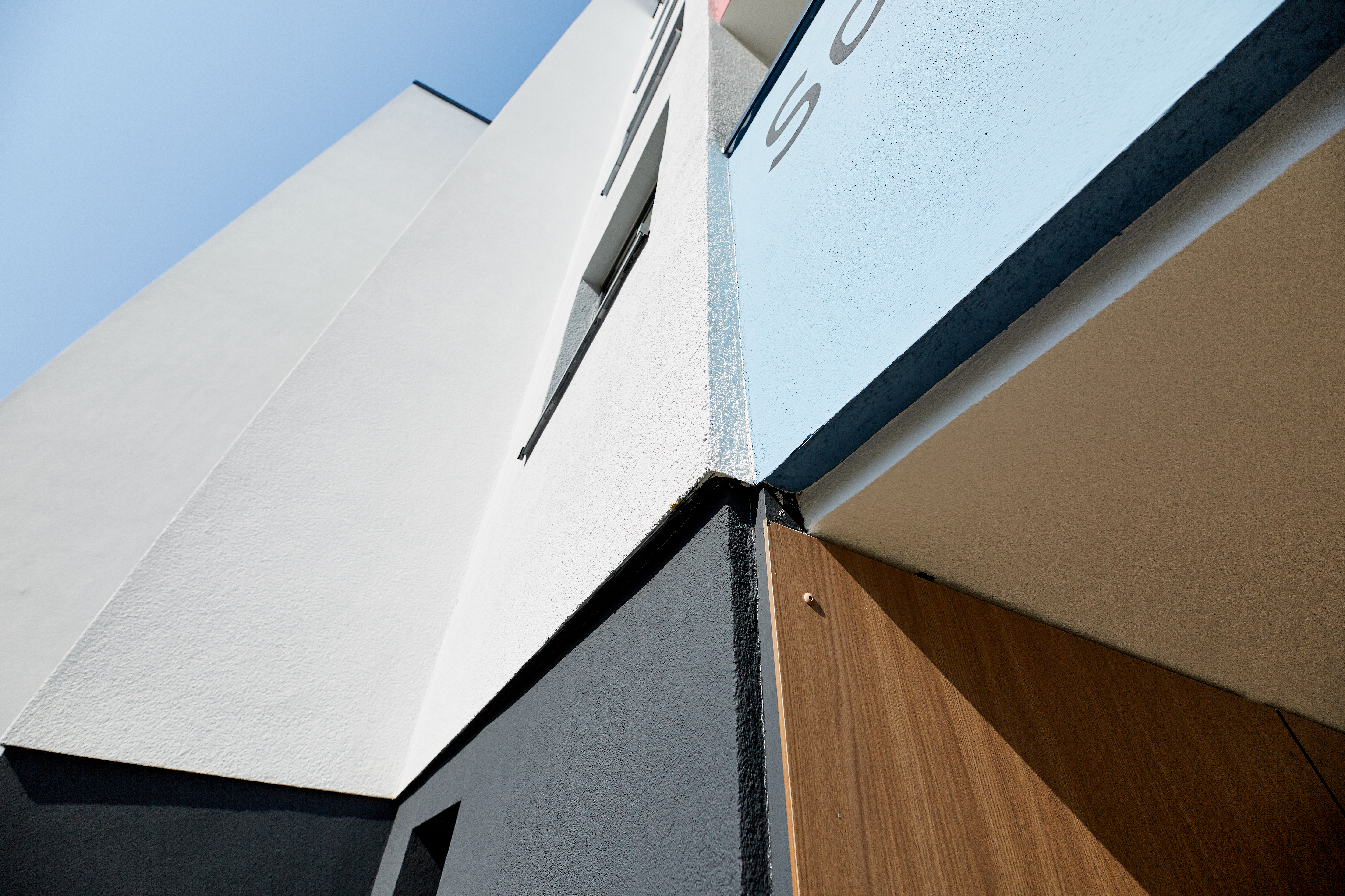 eine moderne, freundliche gestaltung sollte das triste dunkelbraun der hauswände ablösen. in einer wellenbewegung ziehen sich die gewählten farbtöne über die fassaden.