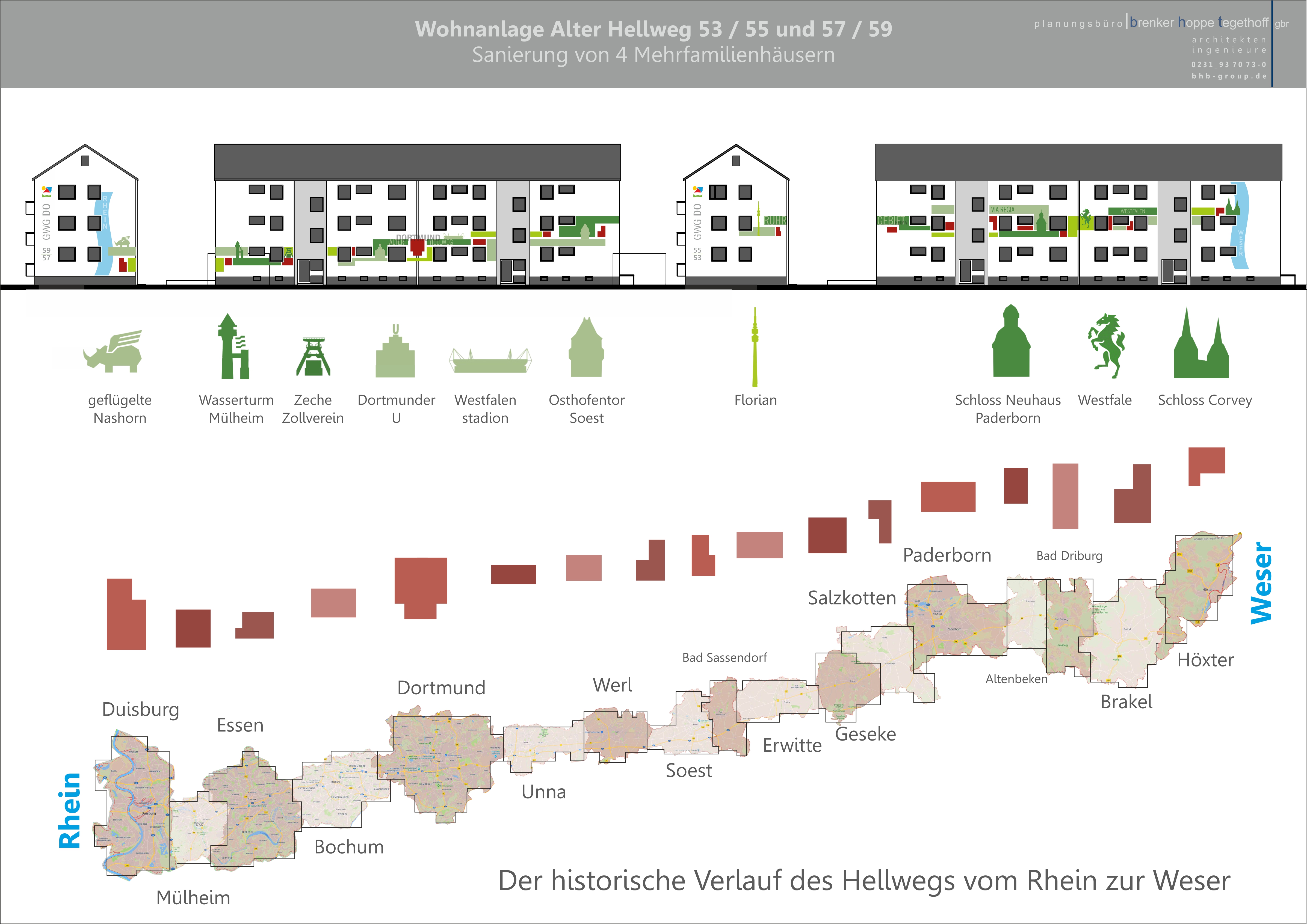der bezug zum ort tritt in den fokus. die lage des sanierungsobjektes direkt am alten hellweg gab den entscheidenden ausschlag, die historie um den hellweg als handelsweg, ort der kommunikation und des wandels zu thematisieren und den verlauf auf der fassade erlebbar zu machen. im zuge der sanierung werden die fenster ausgetauscht, eine zentrale gasheizung mit heizkörpern installiert anstelle der alten nachtspeicher. die fassade erhält eine neue dämmung aus mineralfaser und die dächer werden gedämmt und neu gedeckt.