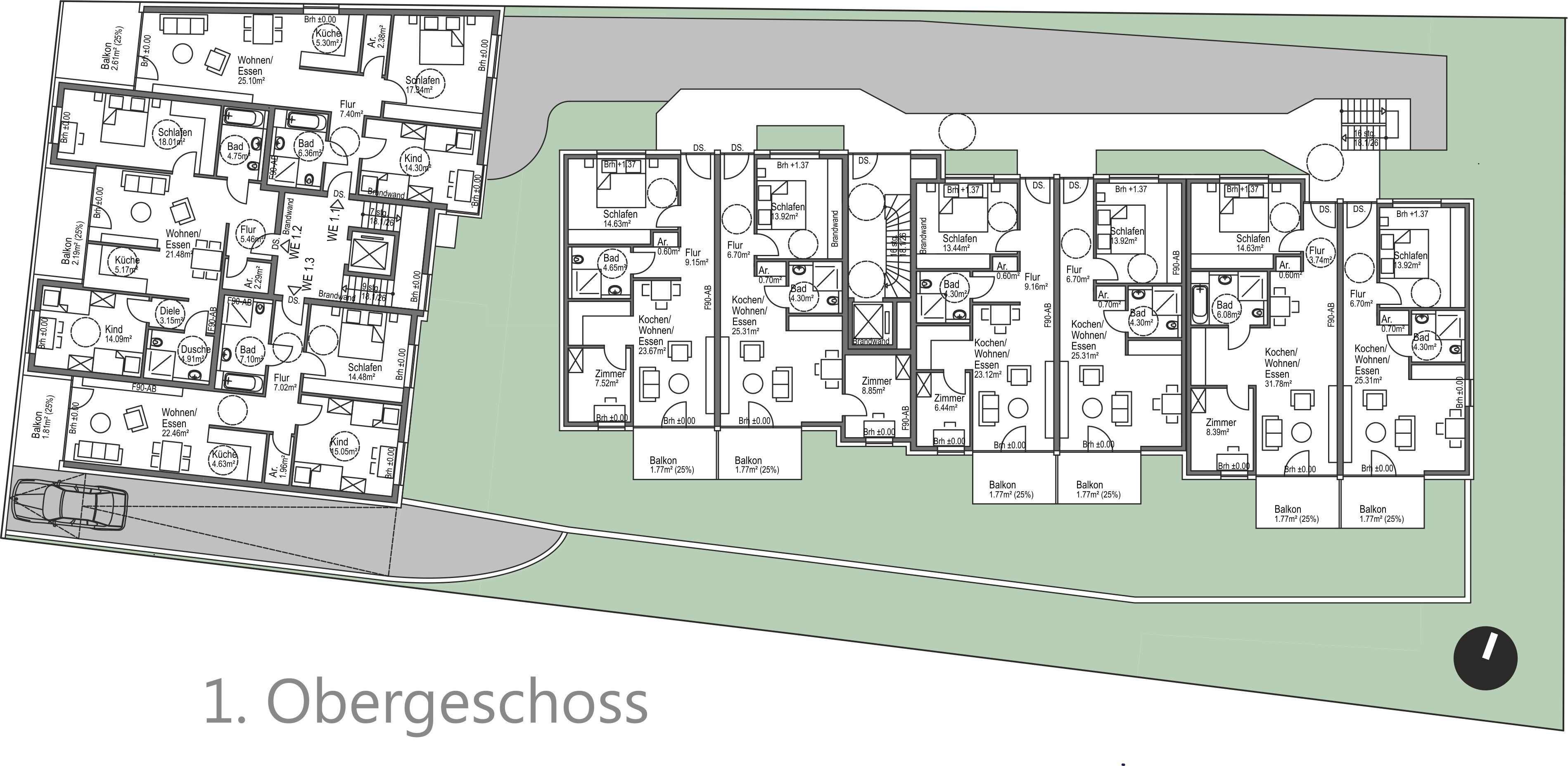 Es werden im Strassengebäude insgesamt 12 WE geschaffen mit ca. 750m² Wohnfläche, davon sieben 2-Raum-WE und fünf 3-Raum-WE.