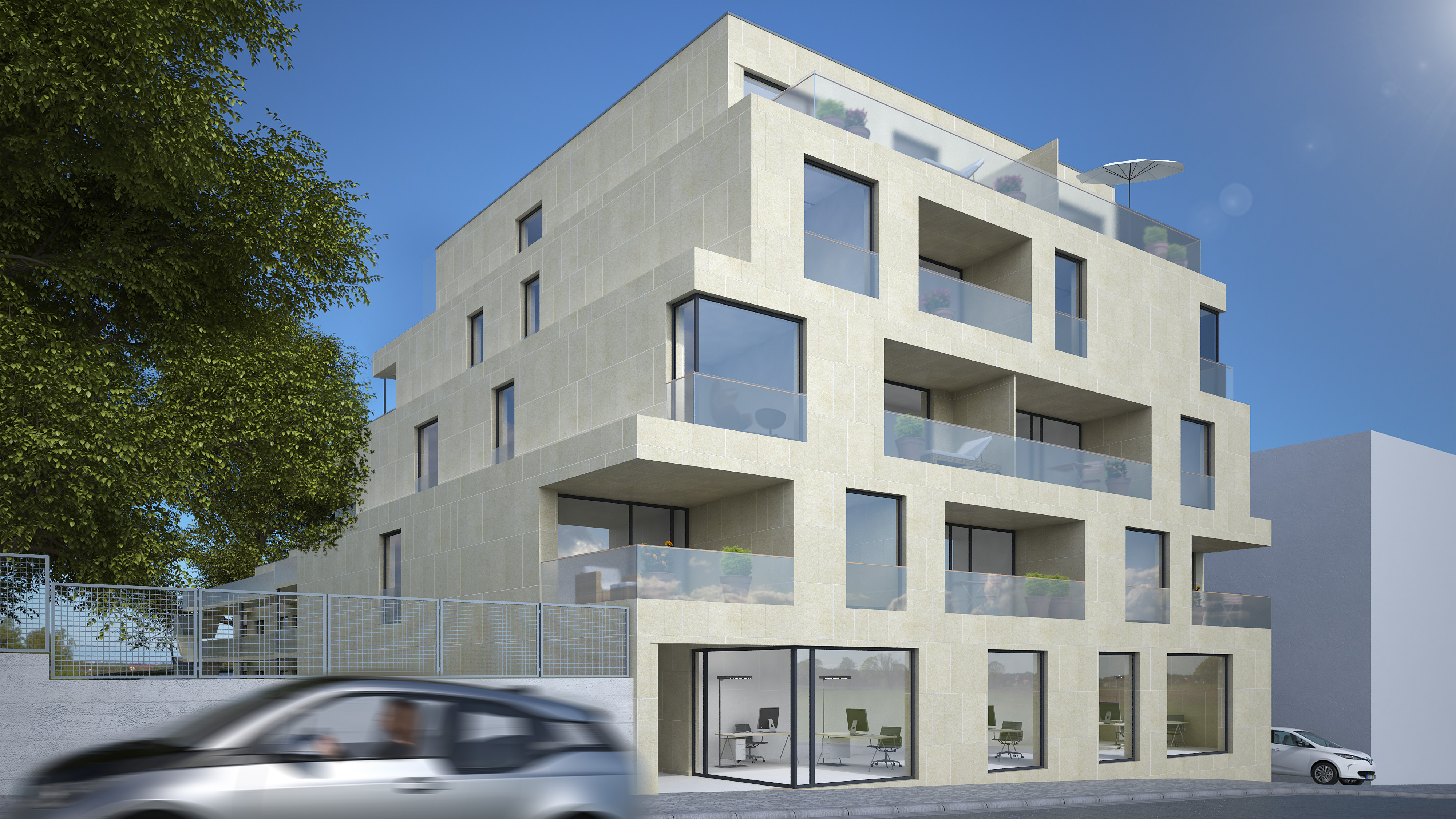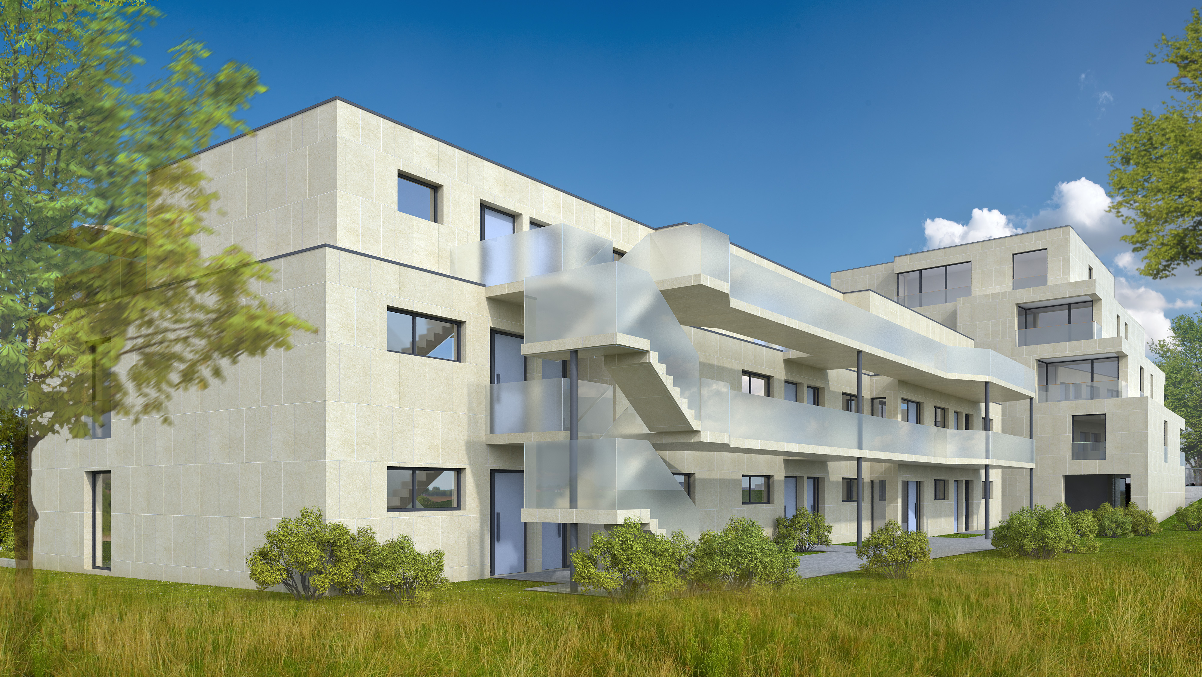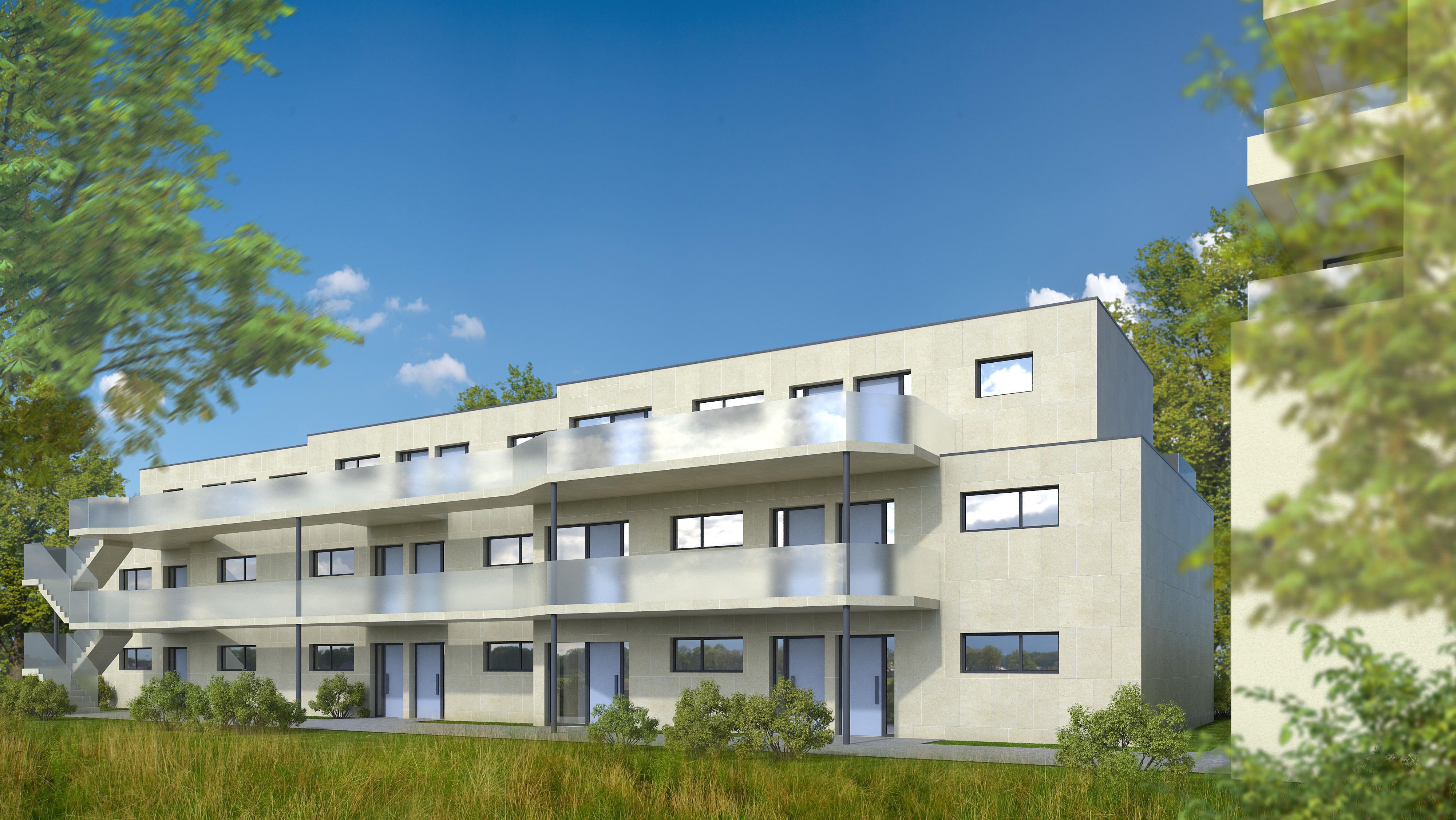 Das Gebäude zur Westricher Straße ist geplant mit vier Vollgeschossen und einem zurückgesetzten Staffelgeschoss. Im Erdgeschoss befindet sich eine Gewerbefläche und der Hauptzugang zum