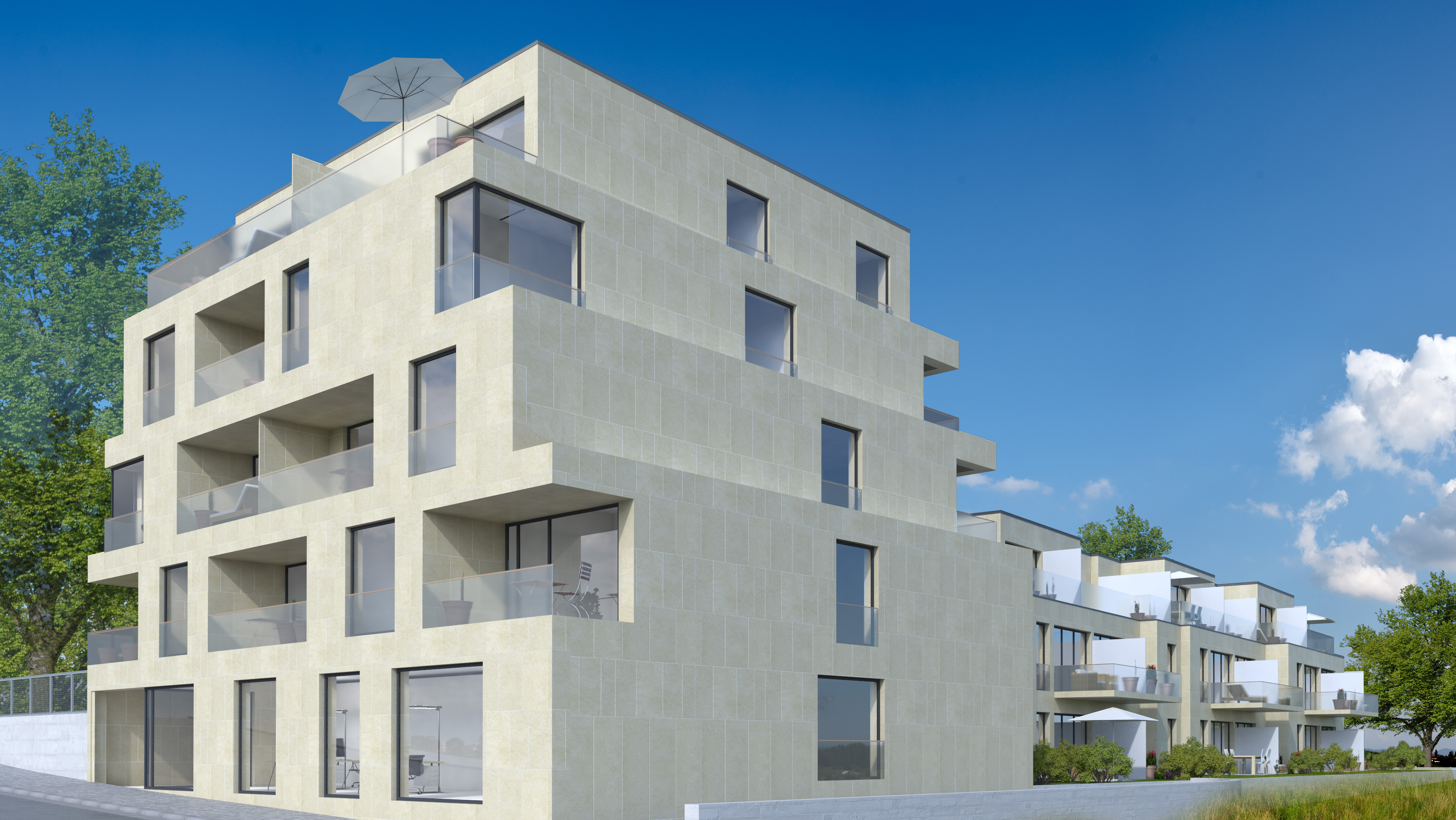Die Fassade des Strassengebäudes wird in Sandstein ausgeführt. Das Format richtet sich nach den Materialeigenschaften, soll jedoch in grösseren Platten angebracht werden.