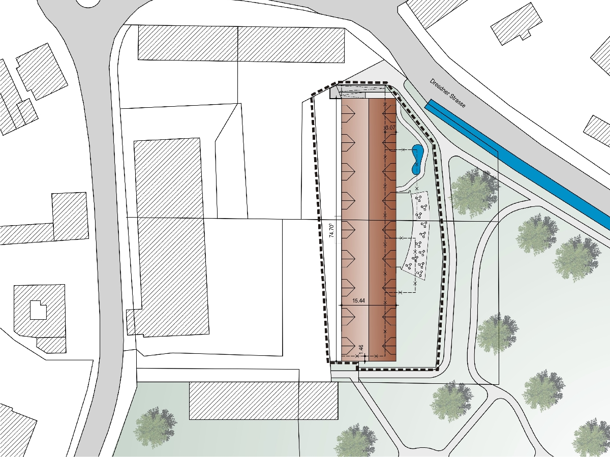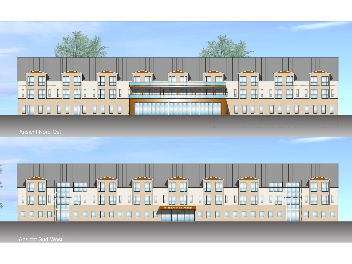 Das zu bebauende Grundstück ist Teil eines historischen Gebäudeensembles, welches durch den Neubau an der Stelle des ehemaligen Stallgebäudes deutlich aufgewertet wird, jedoch in seiner städtebaulichen Funktion (Hofsituation) gestärkt wird. Das neue Gebäude der Pflegeeinrichtung orientiert sich hinsichtlich Trauf- und Firsthöhe an der Umgebung, die Grundfläche wird geringfügig modifiziert, um den Anforderungen an die neue Nutzung Rechnung zu tragen (Flurbreiten / Zimmergrößen). Zum Park hin öffnet sich das Gebäude an der Stelle wo einst die Nebengebäude der Stallung standen mit dem erweiterten Cafébereich, sowie Terrassen, die die Bewohner zum Verweilen einladen.