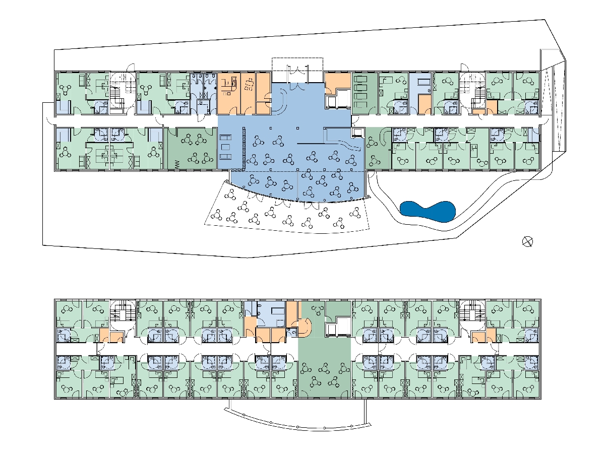 Die oberen Geschosse verfügen über jeweils 30 Pflege-